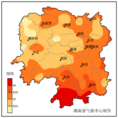 (一)全省平均气温大范围偏高。预计3月平均气温湘西州、怀化中北部、邵阳北部、娄底、益阳西部、常德南部、长沙西部、岳阳部分地区为12~13℃,其他大部地区为13~15℃;和常年同期相比,全省均偏高,其中湘中、湘北偏高1℃以上。
