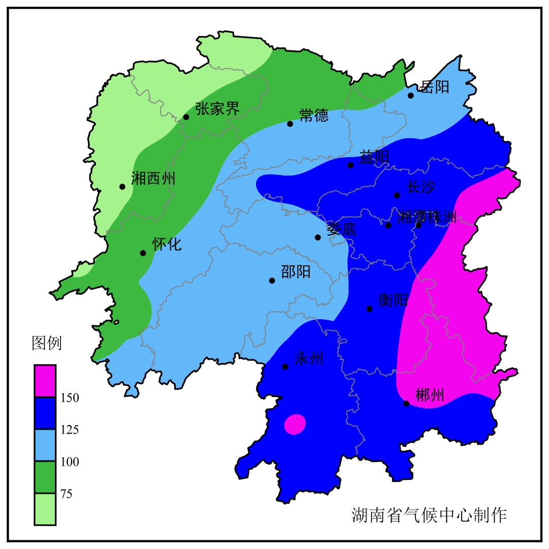 (二)全省月降水量较常年偏少。预计3月降水量湘西州、张家界、怀化西部、常德北部为50~100毫米,其他地区为100~200毫米;和常年同期相比,全省偏少1成左右。