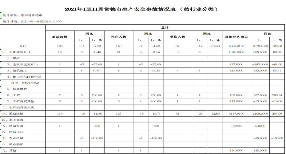 附件:1.2021年1至11月常德市生产安全事故情况表 (按行业分类)