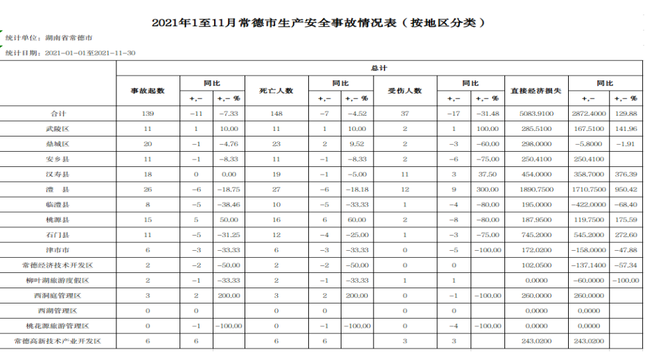 2.2021年1至11月常德市生产安全事故情况表(按地区分类)